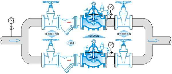 200X减压稳压阀由主阀、导阀、针阀、球阀、微型过滤器和压力表组成水力控制接管系统。使用时,当调定出口压力后,能自动保持稳定出口压力。